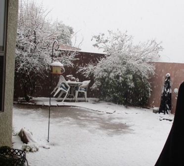 The left side of the back yard about two hours ago. It was having a hard time covering the area out by the pomegranate tree. That now looks like the other side of the yard. Covered!!!