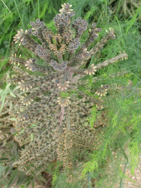 This is the other version that I call Mother of Millions. They are very pretty as they are, but about Christmas time, they have beautiful clusters of coral red flowers at the top that look like a firecracker display in the sky.